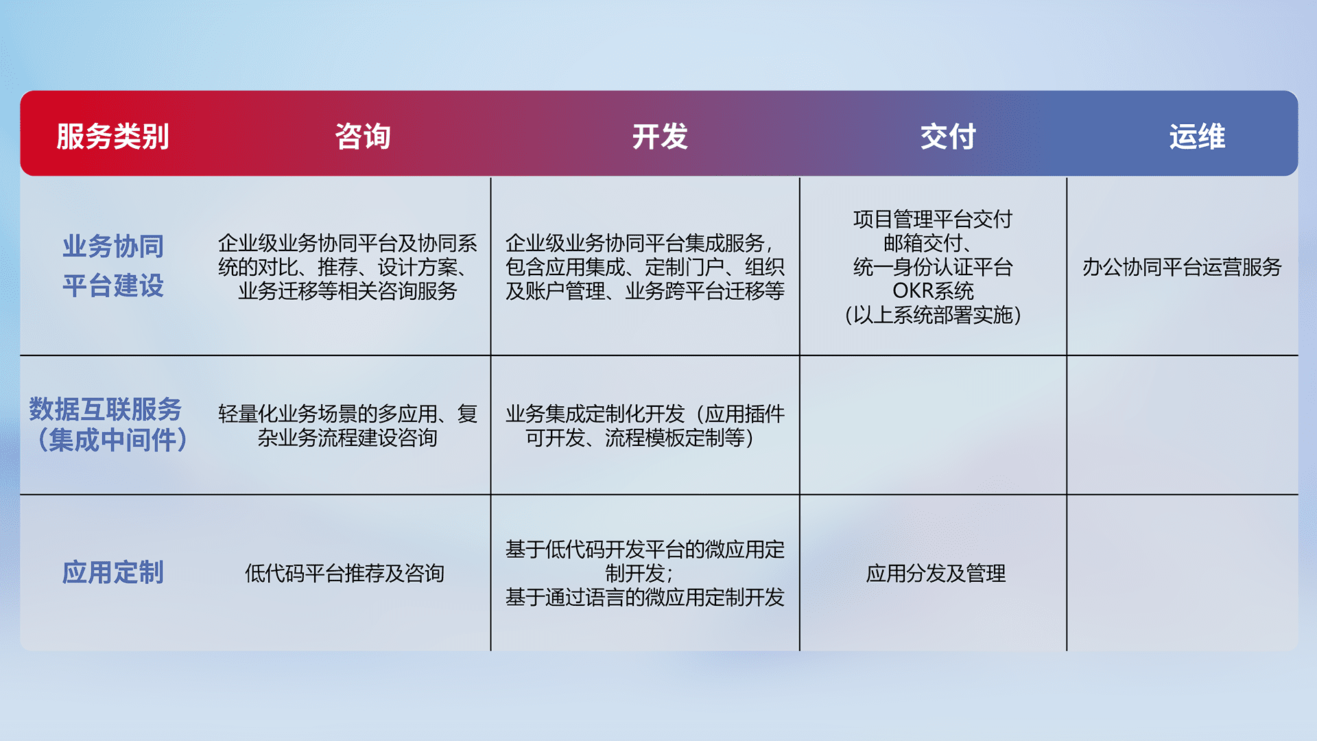 针对钉钉、、、、企微、、、IDaas等平台级产品提供产品的规划、、、、方案、、、、交付、、定制化开发等服务,,,,实现如统一协同办公、、、智能客户服务、、混合会议管理、、、、智能数据查询、、、、等业务场景,,,,实现数字化转型。。。。