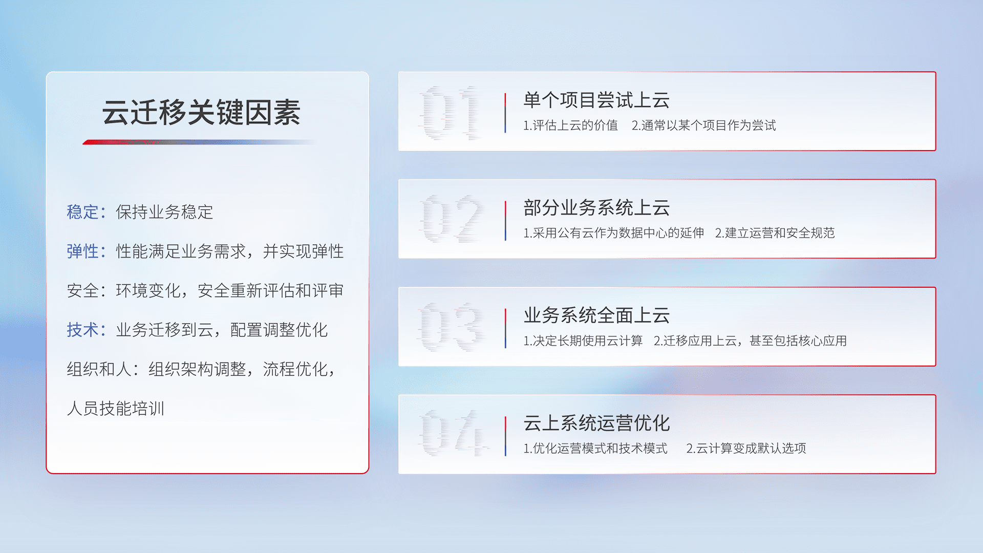 结合实际业务,,,,从规划设计、、云平台选型、、云原生改造、、数据迁移、、集成交付,,,,迁移全过程为客户识别最佳上云路径,,,做好风险识别管理,,,设计网络架构、、、、身份权限、、、、安全审计合规、、操作审计、、、、日志审计、、监控告警策略、、、多站点容灾设计等,,,,对云上基础设施进行整体规划,,,提升IT治理水平,,以满足弹性、、、高可用、、、、高性能的需求。。。